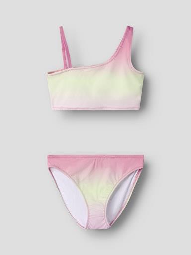 Otroške dekliške modne bikini kopalke z all over "tie-dye" vzorcem na zgornjem in spodnjem delu, z eno tanko in eno široko naramnico, s klasičnim slip spodnjim delom. Material: 80% poliamid, 20% elastan; podloga: 100% poliester