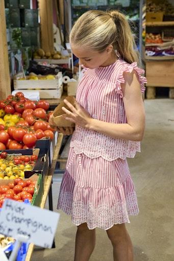 Otroško dekliško krilo blagovne znamke KIDS ONLY, iz prijetnega in lahkega materiala, z all over črtastim vzorcem, spodnji rob z luknjičastim pasom, z elastiko in vrvico v pasu, dolžina do kolen, regular kroj. Material: 100% ekološki bombaž