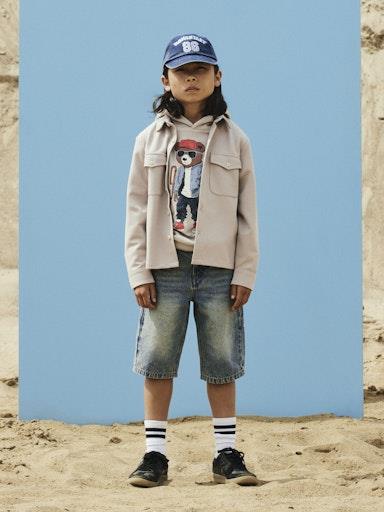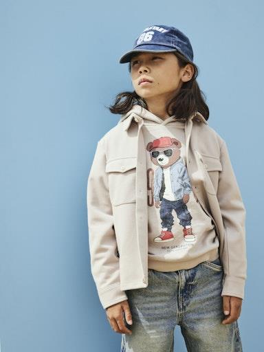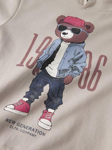 Otroški fantovski pulover s kapuco iz prijetnega in udobnega bombaža, z mehkim rebrastim patentom na zaključkih, s potiskom spredaj, nekosmaten material, regular kroj, dolg rokav. Material: 80% ekološki bombaž, 20% recikliran bombaž