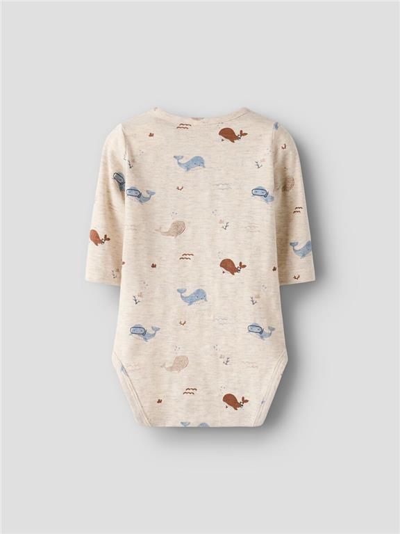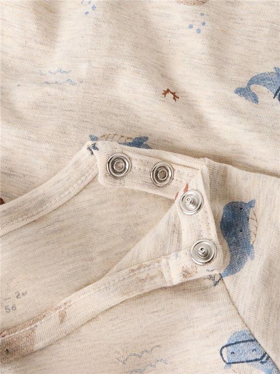 Otroški fantovski body z all over potiskom, iz prijetnega in udobnega ekološkega bombaža, zapenjanje na rami s skritimi pritiskači, dolg rokav. Material: 95% ekološki bombaž, 5% elastan