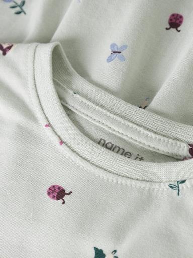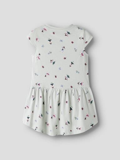 Otroška dekliška poletna obleka z igrivim all over vzorcem, rahlo daljši kroj zadaj, z elastiko v pasu, kratek rokav. Material: 100% bombaž