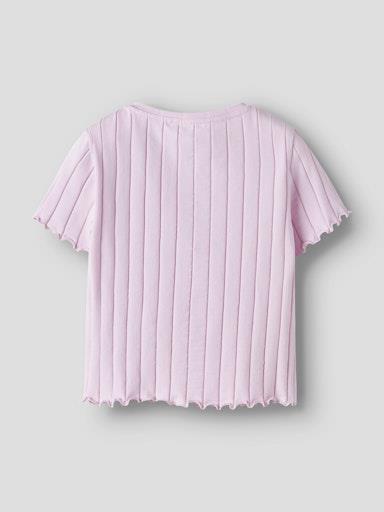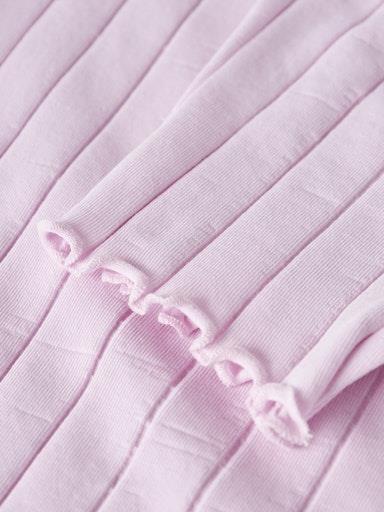 Otroška dekliška modna majica iz prijetnega rebrastega materiala, z valovitimi zaključki na robovih, krajši in ožji kroj, kratek rokav. Material: 95% ekološki bombaž, 5% elastan