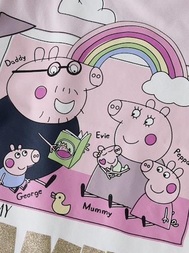 Otroška dekliška majica s prikupnim licenčnim potiskom priljubljene Pujse Pepe, z bleščičastimi detajli, rahlo nabrana na ramenih, regular kroj, dolg rokav. Material: 95% bombaž, 5% elastan
