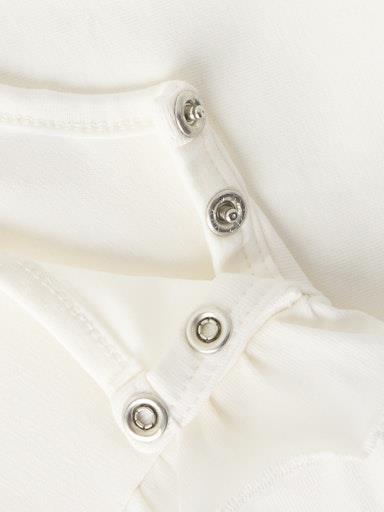 Otroški dekliški body z mehkim potiskom spredaj, z volančki na ramenih, s potiskom spredaj, zapenjanje na rami s skritimi pritiskači, dolg rokav. Material: 95% ekološki bombaž, 5% elastan