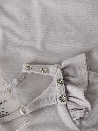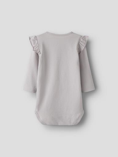 Otroški dekliški body z mehkim potiskom spredaj, z volančki na ramenih, s potiskom spredaj, zapenjanje na rami s skritimi pritiskači, dolg rokav. Material: 95% ekološki bombaž, 5% elastan