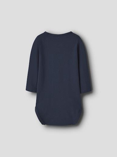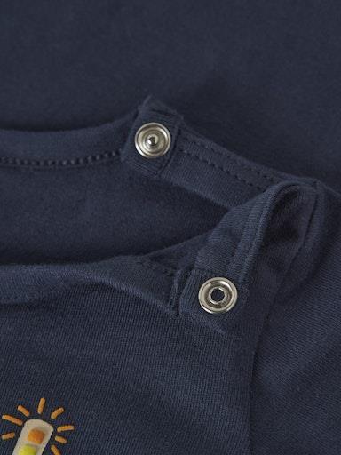 Otroški fantovski body z potiskom spredaj, zapenjanje na rami s skritimi pritiskači, dolg rokav. Material: 95% ekološki bombaž, 5% elastan