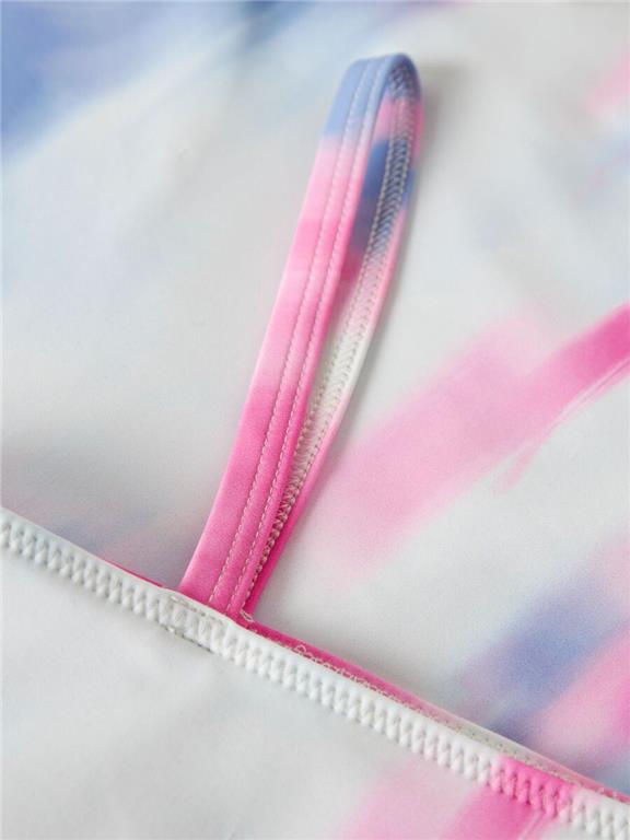 Otroške dekliške modne bikini kopalke z all over "tie-dye" vzorcem na zgornjem in spodnjem delu, z eno tanko in eno široko naramnico, s klasičnim slip spodnjim delom. Material: 80% poliamid, 20% elastan; podloga: 100% poliester