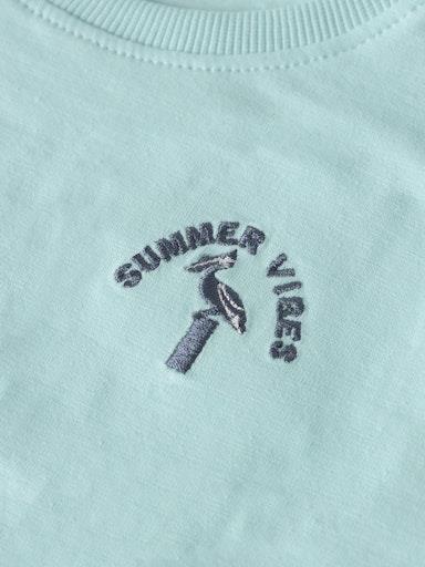 Otroška fantovska majica iz prijetnega ekološkega bombaža, z izvezenim vzorcem spredaj, rahlo širši in krajši kroj, kratek rokav. Material: 95% ekološki bombaž, 5% elastan