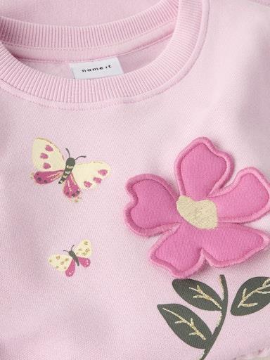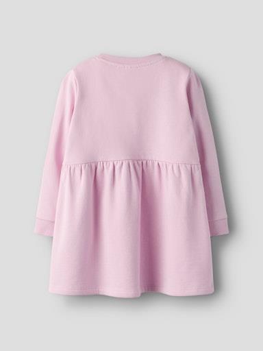 Otroška dekliška modna obleka iz prijetnega in udobnega bombaža, z dekorativnim 3D našitkom spredaj, z elastiko va pasu, z mehkim rebrastim patentom na zapestjih, nekosmaten material, širši kroj, dolg rokav. Material: 51% ekološki bombaž, 49% bombaž
