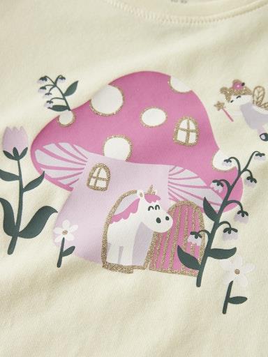 Otroška dekliška majica z dekorativnim potiskom, iz mehkega in prijetnega bombaža, z zavihki na rokavih, regular kroj, kratek rokav. Material: 95% ekološki bombaž, 5% elastan