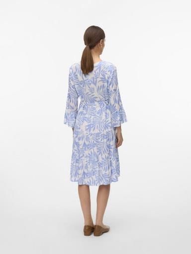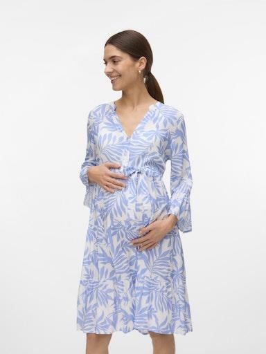 Nosečniška modna poletna obleka, z all over poletnim vzorcem, iz lahke in prijetne viskoze, zgornji del z zapenjanjem na gumbe, kar omogoča lažje dojenje, z elastiko nad trebuščkom, z dodanim pačkom za zavezovanje, rahlo nabran spodnji del, s 3/4 dolgimi širokimi rokavi, z volančki na zaključkih. Prilagodljiv kroj za rastoč trebušček. Material: 100% viskoza- Livaeco by Birla Cellulose™