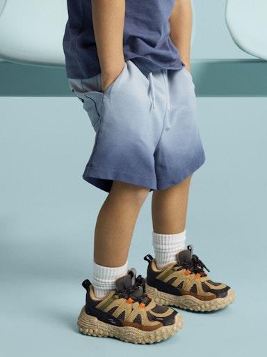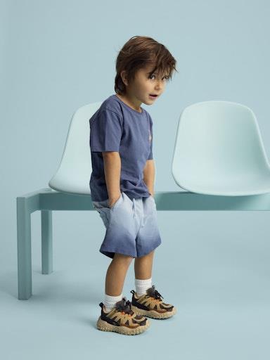Otroške fantovske modne kratke hlače iz prijetnega ekološkega bombaža, v modni kombinaciji barv, ki se prelivajo, z elastiko in vrvico v pasu, z dvema žepoma spredaj in enim žepom zadaj, z dekorativnim našitkom zadaj, nastavljiva širina pasu, regular kroj. Material: 95% ekološki bombaž, 5% elastan