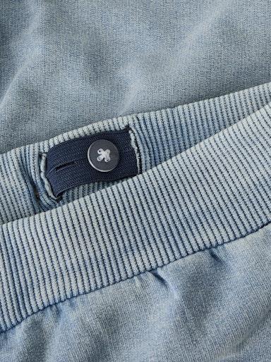 Otroške fantovske modne kratke hlače "sweat" kakovosti v videzu spranega jeansa, z elastiko in vrvico v pasu, z dvema žepoma spredaj in enim žepom zadaj, nekosmaten material, nastavljiva širina pasu, dolžina do kolen, regular kroj. Material: 79% ekološki bombaž, 16% poliester, 5% elastan