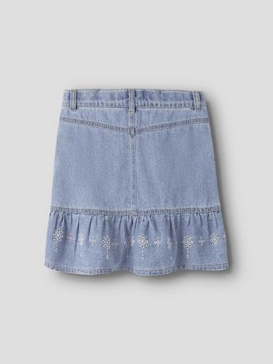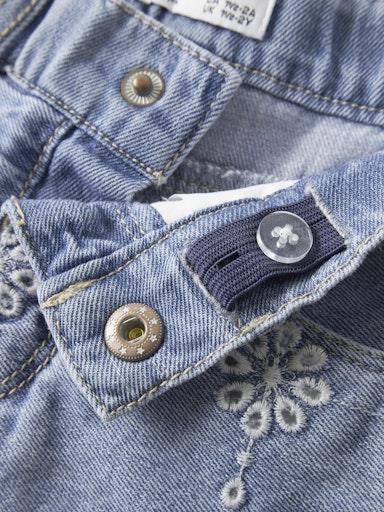 Otroško dekliško jeans krilo, z dvema žepoma spredaj in zankami za pas, z izvezenim in luknjičastim vzorcem na spodnjem delu, spranega videza, nastavljiva širina pasu, regular kroj. Material: 80% bombaž, 20% recikliran bombaž