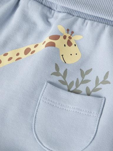 Otroške fantovske hlače iz prijetnega ekološkega bombaža, s široko elastiko v pasu, z rebrastimi zaključki, s potiskom in žepkom zadaj, nekosmaten material, regular kroj. Material: 95% ekološki bombaž, 5% elastan