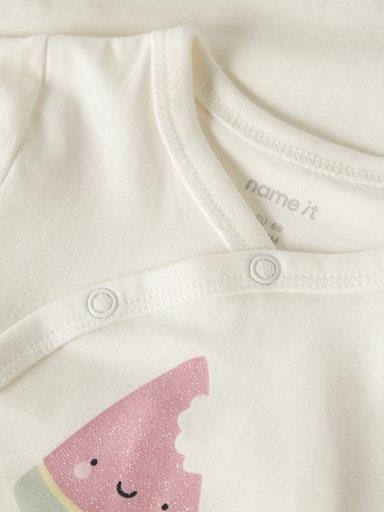 Otroški dekliški body na preklop iz prijetnega ekološkega bombaža, s potiskom spredaj, regular kroj, kratek rokav. Material: 95% ekološki bombaž, 5% elastan