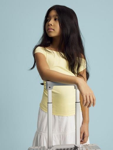 Otroška dekliška modna majica iz prijetnega materiala, rahlo nabrana na straneh, krajši in oprijet kroj, brez rokavov. Material: 86% poliester, 14% elastan