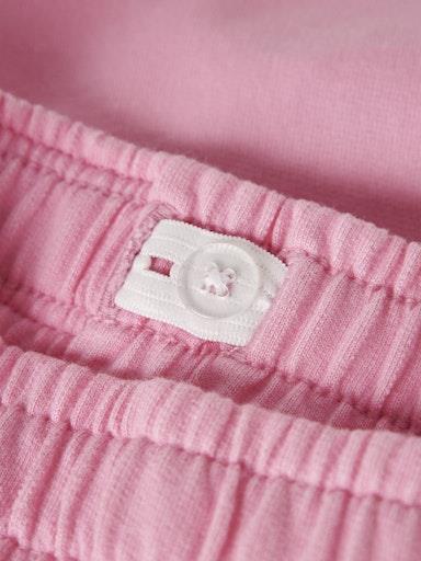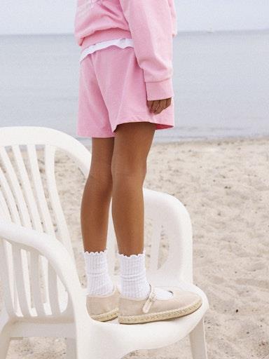 Otroške dekliške modne kratke hlače iz prijetnega ekološkega bombaža, z elastiko in dekorativnim našitkom v pasu, z dvema žepoma spredaj, nekosmaten material, nastavljiva širina pasu, regular kroj. Material: 100% ekološki bombaž