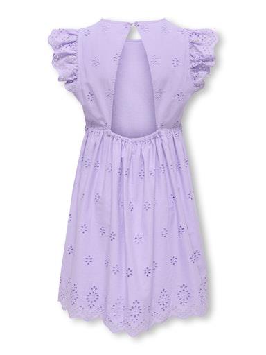Otroška dekliška modna obleka blagovne znamke KIDS ONLY, iz prijetnega ekološkega bombaža, z all over luknjičastim vzorcem, z volančki na rokavih, z odprtino in elastiko zadaj, z mehko podlogo, zapenjanje z gumbom zadaj, regular kroj, kratek rokav. Material: 100% ekološki bombaž