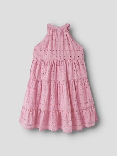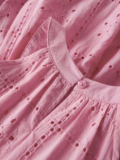 Otroška dekliška modna obleka iz prijetnega in udobnega bombaža, z all over luknjičastim vzorcem, udoben A-kroj, rahlo nabrana, z visokim ovratnikom, zapenjanje z gumbom zadaj, brez rokavov. Material: 100% bombaž