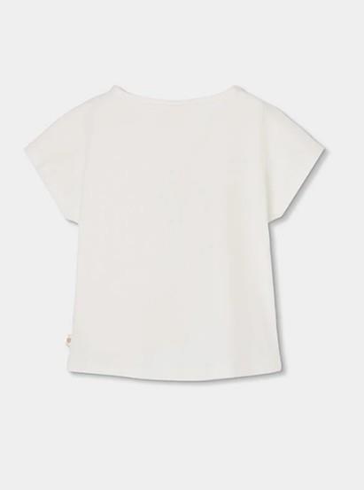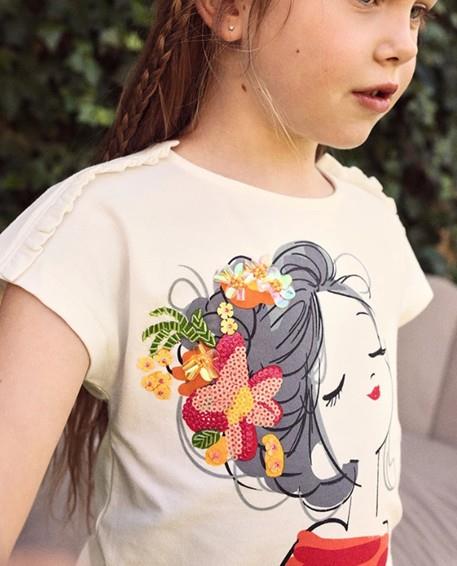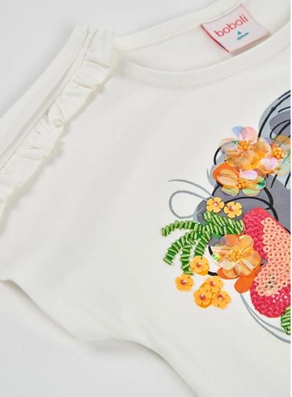 Otroška dekliška modna majica blagovne znamke BOBOLI, iz prijetnega in udobnega materiala, s potiskom spredaj, z našitimi bleščicami spredaj, z dekorativnim našitkom na strani, regular kroj, kratek rokav. Material: 92% bombaž, 8% elastan